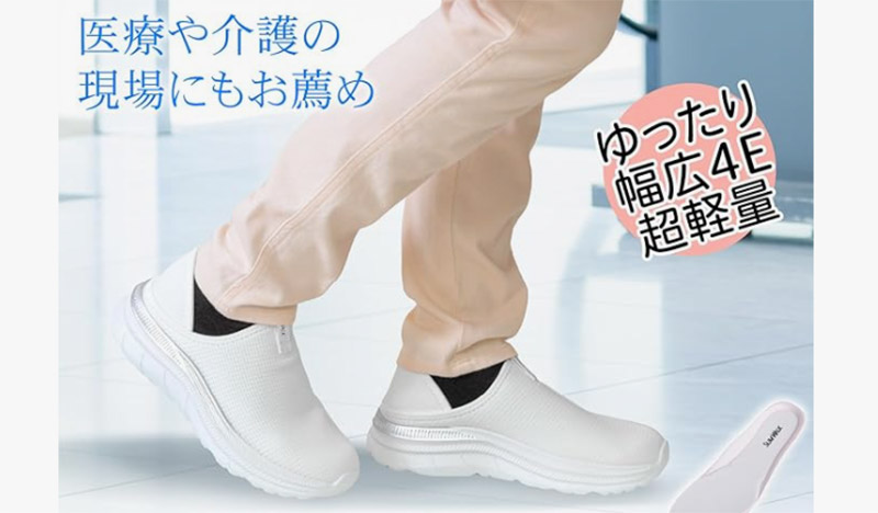 医療用品メーカー マツヨシの定番モデルで、現場の看護師さんから取材でも真っ先に名前が挙がった1足です。 幅広4Eでかかと踏み切替ができる2Way仕様なので、忙しい病棟で「どっちでも使える」のが強みでした。
